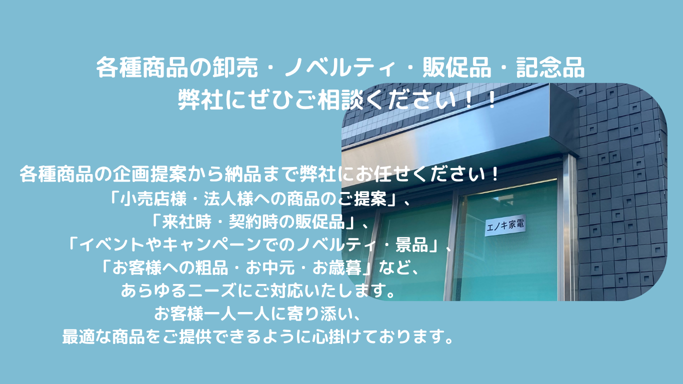 取扱商品:ノベルティ・販促品・ギフト用品・生活家電/雑貨・ヘルスケア用品 等